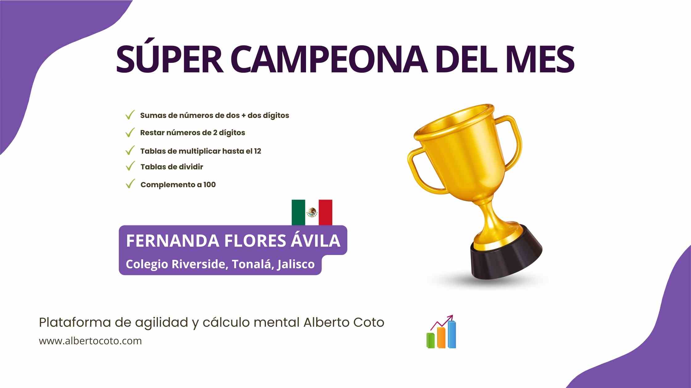 Hoy tenemos una novedad inspiradora que celebrar. La destacada Fernanda Flores Ávila se ha convertido en la Súper Campeona del Mes en la plataforma de Alberto Coto. Su dedicación y habilidad para el cálculo mental la han llevado a alcanzar este prestigioso diploma. Fernanda tiene 9 años ...