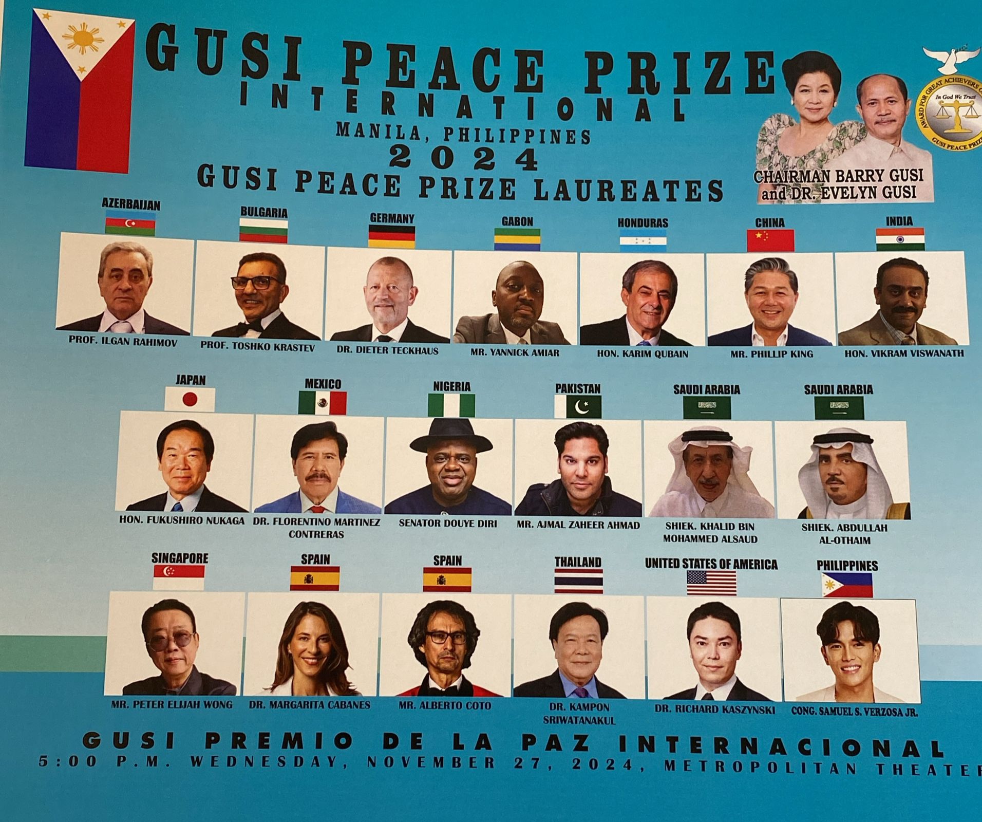 Presidente del Premio Mundial de la Paz He sido nominado y ganador del Premio Internacional de la Paz Gusi 2024 que recibiré en noviembre, en Manila. La Fundación Premio Internacional de la Paz Gusi, conocida como la contraparte asiática del Premio Nobel sueco, anunció esta nominación desde su ...